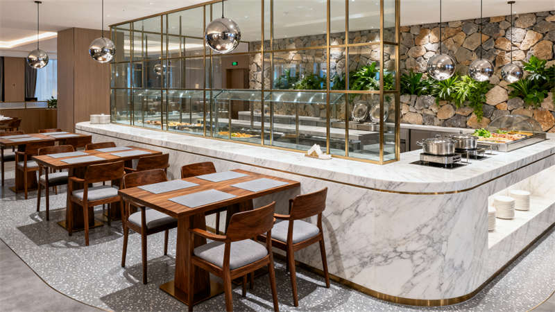 公共區(qū)域與客房保持風(fēng)格一致,從外觀的玻璃幕墻與石材拼接,到室內(nèi)大堂的胡桃木格柵背景墻、餐廳的金屬框架與大理石臺面,每一處細(xì)節(jié)都延續(xù)了現(xiàn)代輕奢的設(shè)計語言。軟裝選擇上,莫蘭迪色系的抱枕、暖橘色的點綴,以及自然綠植的融入,為空間增添了溫馨感,讓整體裝修既顯精致格調(diào),又避免了冰冷生硬,全方位提升了酒店的居住與體驗質(zhì)感。?