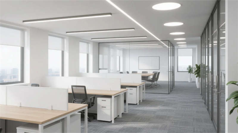 外立面采用橫向分割的玻璃幕墻與淺灰金屬框架,懸挑雨棚與隱藏式燈帶強化幾何美學,夜晚呈現(xiàn)輕盈通透的視覺印象。大堂以白色石材與淺木前臺奠定簡約基調,線性燈帶引導動線,綠植墻與玻璃隔斷休息區(qū)平衡商務與休閑氛圍。辦公區(qū)通過白色工位隔斷與淺木桌面實現(xiàn)高效布局,線性燈光與落地窗引入充沛自然光,玻璃會議室保障通透視野。