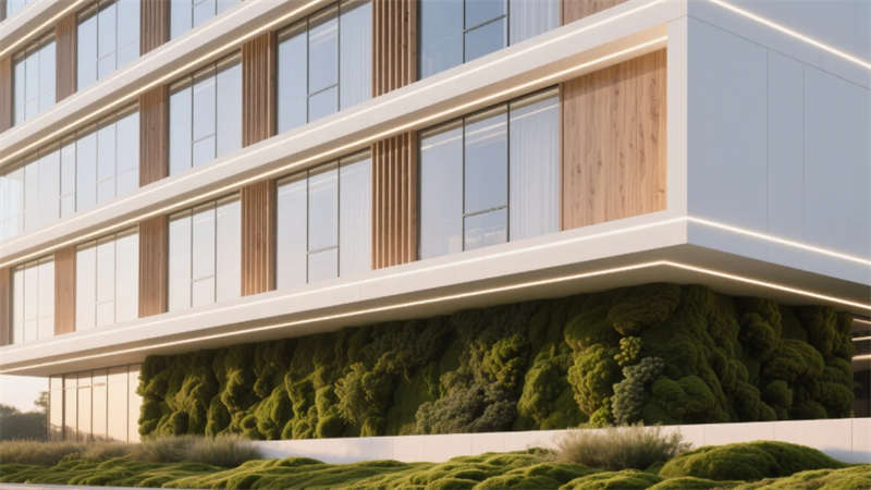 本案立足合肥科技創(chuàng)新城定位,以“自然滲透科技”為核心策略,打造7000㎡智慧辦公綜合體。外立面通過(guò)雙層呼吸式幕墻與垂直木紋格柵交織,形成動(dòng)態(tài)光影濾網(wǎng),底部苔蘚景觀帶同步凈化PM2.5,實(shí)現(xiàn)建筑與巢湖生態(tài)區(qū)氣候的有機(jī)對(duì)話。