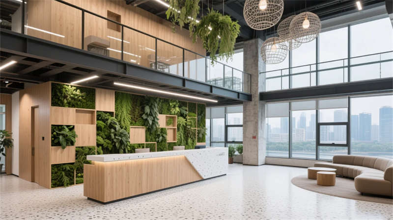本項目以“自然滲透”與“靈活共生”為核心,將輕工業風的理性框架與生態綠意巧妙融合。空間打破傳統辦公割裂感,通過綠植墻體、透光天井與流動線條,在合肥城市肌理中營造出呼吸感十足的職場綠洲。