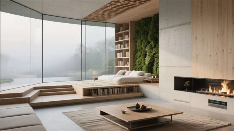客房以極簡的智慧回應棲居本質。榻榻米地臺消弭床與地面的界限,270°環(huán)景霧化玻璃輕觸即透,仿生綠植在智能光影中呼吸生長,隱藏式投影幕布落下時,星空與林海皆成私享背景。階梯書吧的垂直綠植墻下,模塊化沙發(fā)隨需求自由組合,全息粒子在空氣中勾勒出流動的藝術,而巖板中島餐廳里,藤編座椅與吊燈矩陣的光暈交織,智能調光天窗讓每一餐都浸染著天光的溫度。