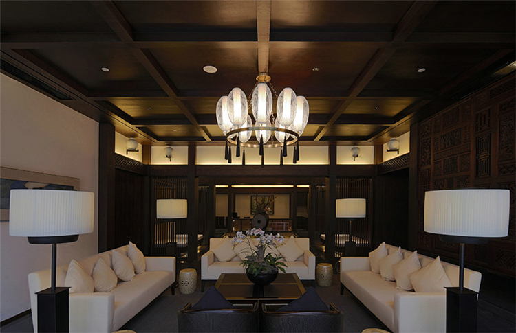 走入大堂,室內空間寬闊,天花鱗次櫛比通向樓梯方向,墻面灰色石材雕刻,將桃花源記中的詩句映入客人眼簾,禪境古意撲面而來。鏤空屏風隔墻的設計,讓空間隔而不斷,與具有傳統韻味的家具和配飾相互交融,打斷俗世的紛擾。柱子和天花上的裝飾燈具,利用金屬和木材兩種截然不同的材料和質地,創造空間內在張力,透過銳利的金屬、細膩的木質線條強調空間結構,精致筆挺的吊燈,令空間由內向外展現獨特魅力。