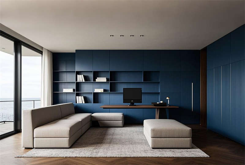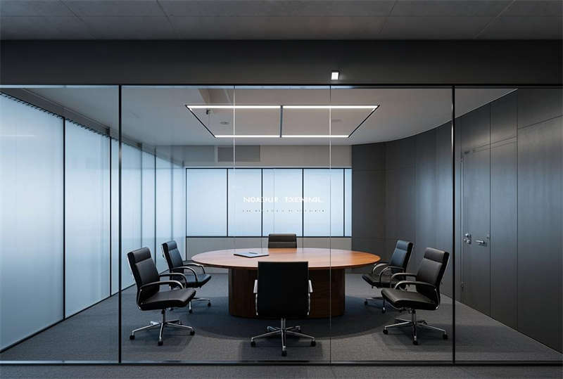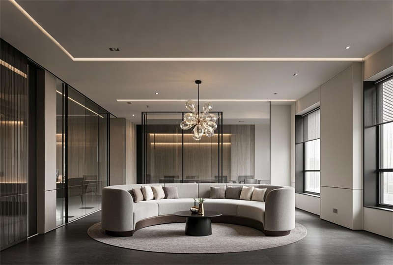 本方案采用現(xiàn)代簡約設(shè)計語言,整體空間以淺灰、白、原木三色為主基調(diào)。前臺區(qū)設(shè)置懸浮式接待臺與發(fā)光LOGO墻,搭配LED線性照明塑造企業(yè)形象。開放式辦公區(qū)采用模塊化工位布局,通過玻璃隔斷劃分功能區(qū)域,保證自然采光最大化的同時提升空間通透感。智能會議系統(tǒng)集成于各會議室,配備電動投影和書寫玻璃墻。經(jīng)理室采用深藍色烤漆木飾面提升商務(wù)質(zhì)感,休息區(qū)設(shè)置咖啡吧與卡座強化員工關(guān)懷。走廊運用導(dǎo)視燈帶串聯(lián)各區(qū)域,茶水間六角地磚增添趣味性。培訓室階梯式布局配合吸音墻面確保聲學效果,電話間磨砂玻璃立方體兼顧隱私與采光。VIP室智能霧化玻璃實現(xiàn)空間靈活轉(zhuǎn)換,整體設(shè)計注重功能分區(qū)與人文關(guān)懷的平衡。
