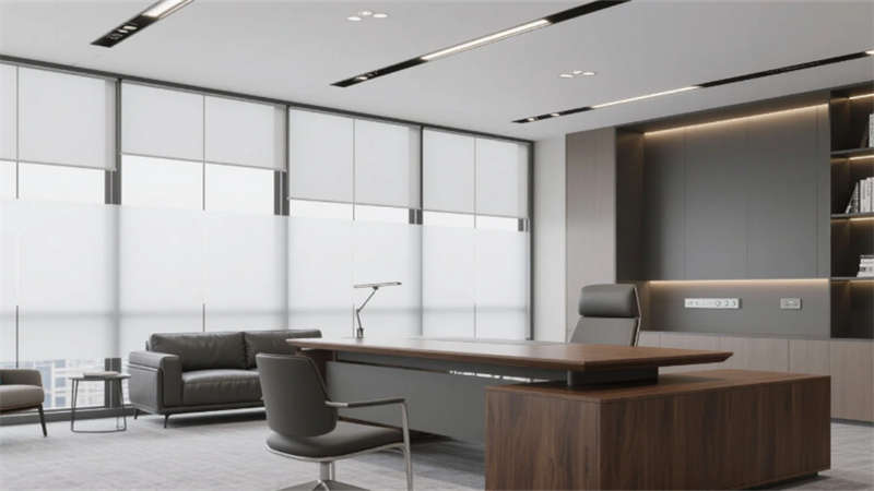 室內空間延續外立面設計語言,企業大堂通過技術創新實現淺白大理石與木紋墻面的無縫拼接,懸浮式線性燈光系統可隨自然光線智能調節色溫。開放式辦公區配置智慧化模塊組合,可升降桌體與軌道射燈靈活適配多元場景,協作島集成無線充電與環境感知功能。高管辦公室采用智能霧化玻璃隔斷,實現隱私與通透的自由切換。科技會議室搭載高清透明顯示系統與多聲道聲學設備,電動百葉簾與補光系統聯動打造智能會議環境。