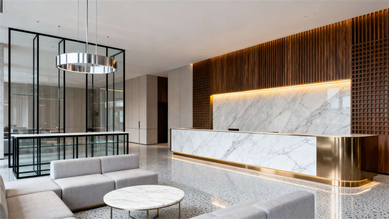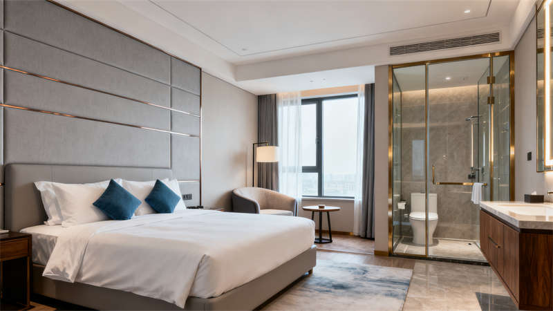 公共區(qū)域與客房保持風(fēng)格一致,從外觀的玻璃幕墻與石材拼接,到室內(nèi)大堂的胡桃木格柵背景墻、餐廳的金屬框架與大理石臺面,每一處細(xì)節(jié)都延續(xù)了現(xiàn)代輕奢的設(shè)計語言。軟裝選擇上,莫蘭迪色系的抱枕、暖橘色的點綴,以及自然綠植的融入,為空間增添了溫馨感,讓整體裝修既顯精致格調(diào),又避免了冰冷生硬,全方位提升了酒店的居住與體驗質(zhì)感。?