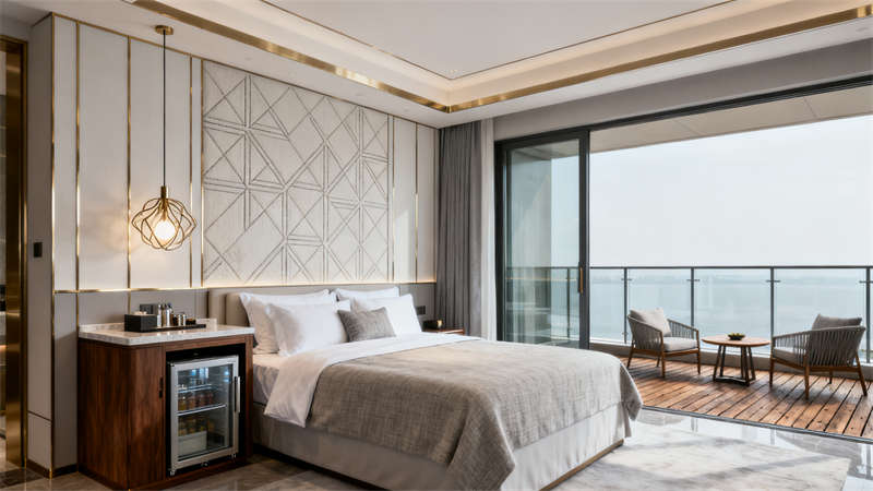 本設(shè)計以現(xiàn)代輕奢為核心風(fēng)格,為蚌埠這家酒店打造出兼具質(zhì)感與溫度的居住體驗。整體空間以低飽和的米灰色系為基底,搭配胡桃木的溫潤與金屬線條的精致,構(gòu)建出統(tǒng)一且富有層次的視覺效果。?