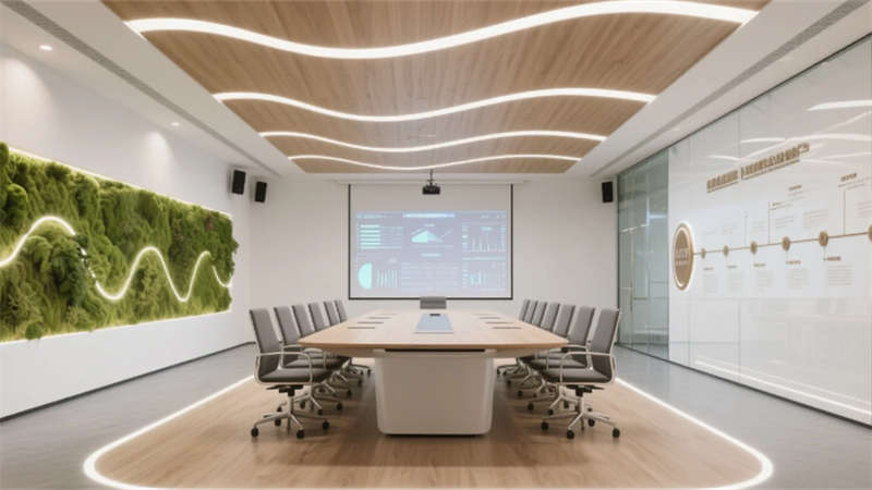 生態(tài)科技體系覆蓋全場(chǎng)景:經(jīng)理辦公室苔蘚墻集成空氣監(jiān)測(cè)系統(tǒng),總裁室霧化玻璃聯(lián)動(dòng)光伏發(fā)電,小會(huì)議室綠植墻搭載微滴灌節(jié)水裝置。材質(zhì)選用安徽本土元素升級(jí)再造,大廳水磨石摻入大別山礦石粉,定制地毯紋樣提取徽派窗欞數(shù)字化變體。