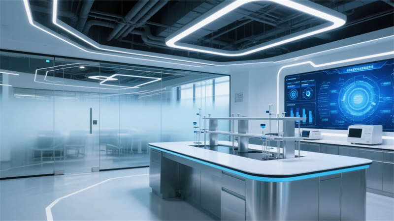 辦公空間呈現(xiàn)去中心化的未來圖景。模塊化工位可隨時重組為頭腦風(fēng)暴環(huán)島,聲學(xué)織物包裹的膠囊艙提供深度思考庇護(hù)所。最具革命性的是“實(shí)驗(yàn)室劇場”,研發(fā)設(shè)備的機(jī)械美學(xué)被提升為空間敘事的主角,集成于銀色島臺的精密儀器與頂部藝術(shù)化排布的管線系統(tǒng),構(gòu)成科技崇拜的現(xiàn)代祭壇。霧化玻璃墻在透明與隱私模式間瞬時切換,象征知識共享與知識產(chǎn)權(quán)保護(hù)的辯證統(tǒng)一。