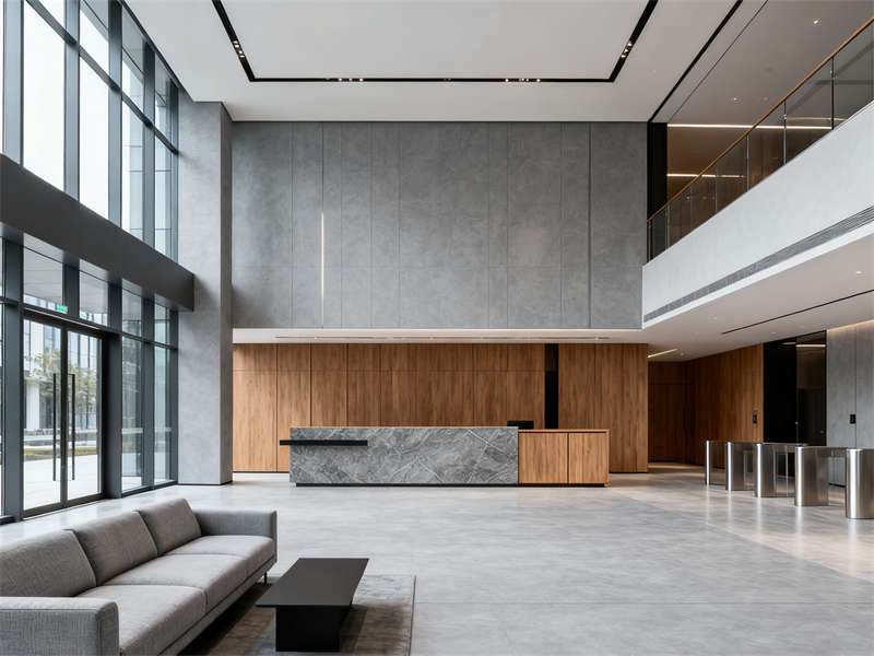 入口大堂以開闊格局為核心,淺灰地磚搭配低飽和木色前臺,弱化厚重感的同時,用金屬線條勾勒細節,讓第一印象既專業又通透。玻璃隔斷貫穿多個區域,在走廊處搭配木色門牌,既保證采光,又通過材質呼應強化整體感,避免空間割裂。