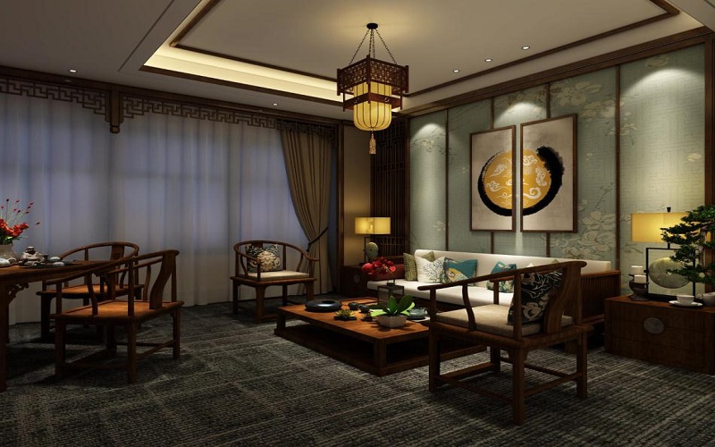 設(shè)計(jì)師在裝修設(shè)計(jì)充分考慮了中式元素的性質(zhì)和特點(diǎn),使其既滿足其功能和經(jīng)營(yíng)特點(diǎn)需求,又兼顧現(xiàn)代技術(shù)要求及中式風(fēng)格.因此在空間的功能、色彩、光影、材料、配飾、綠化等方面都在變化中尋求完美的統(tǒng)一,讓合理的空間格局給人們以美的感受.