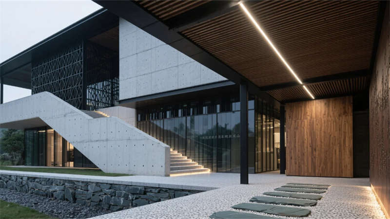 建筑外觀以滁州竹海為靈感,斜交網格結構勾勒出山勢輪廓,穿孔鋁板在光影間呼吸。懸浮橡木雨棚如云中棧橋,將自然意象引入現代語境。青石板基座延伸至室內,形成連貫的在地敘事。
