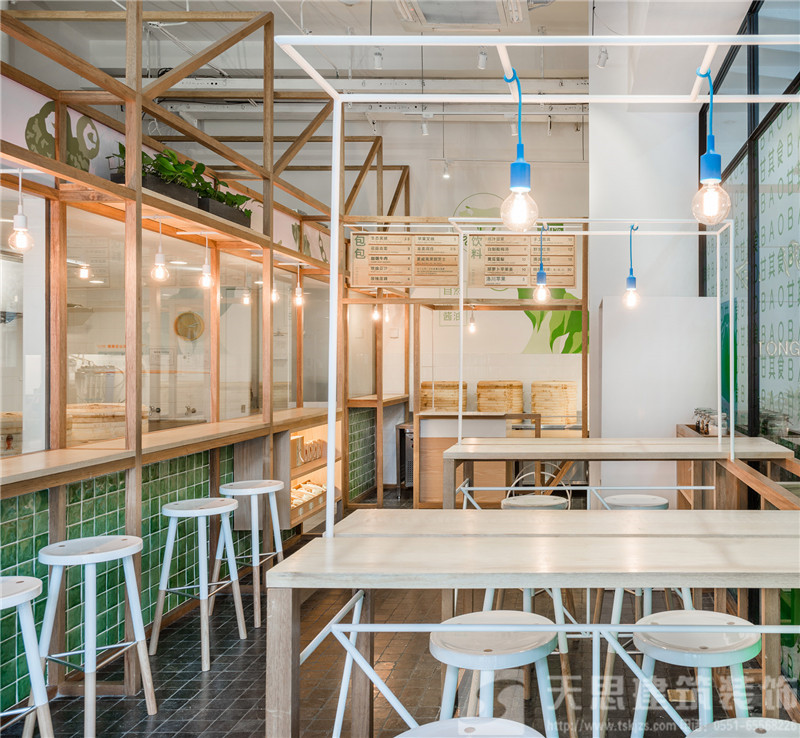 在室內空間結構上,我們傾注了大量巧思。玻璃間是包點制作區,制作人員在玻璃間內完成搟面、包餡和蒸制等一系列工序。玻璃間外的上部空間由木質框架勾勒,以墻上的品牌標志為背景,擺放著盆盆綠植,枝條垂墜而下,清新可人。空間下部加入了吊燈和座位,一方面使得整體結構更為完整,另一方面便于食客觀察了解制作過程。玻璃間上部兼具玻璃與木頭兩種質感,下部的墻體由手工拋光的綠色瓷磚鋪就。店外,玻璃間的一面正對街頭,外延的木質擱板既為顧客提供便利,也使得店鋪內外更為渾然一體。