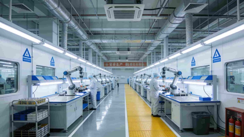 生產區域按需分區:十萬級潔凈電子車間以灰白為主調,配備自動化流水線與防靜電系統;重型設備組裝車間采用耐磨地坪與行車軌道,色彩對比鮮明。辦公區域兼顧協作與專注,開放式卡位、創意辦公區與研發專注艙合理布局,裸頂工藝、原木元素與綠植點綴,平衡工業感與舒適度。