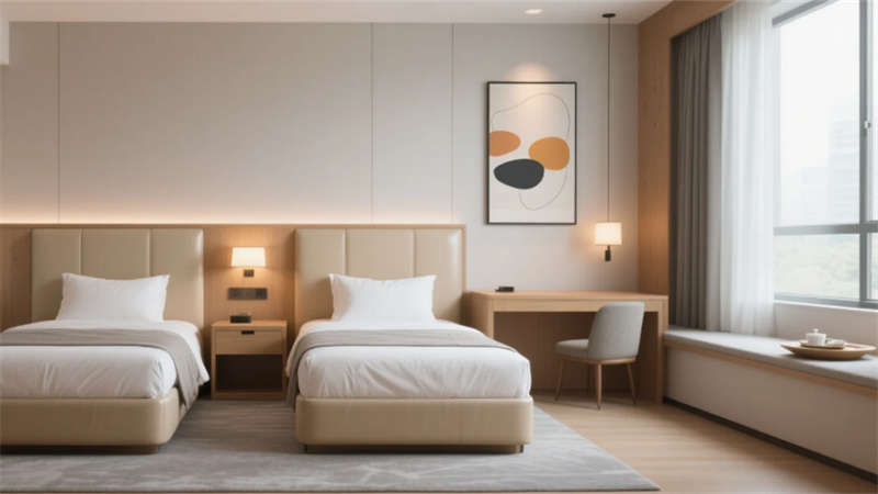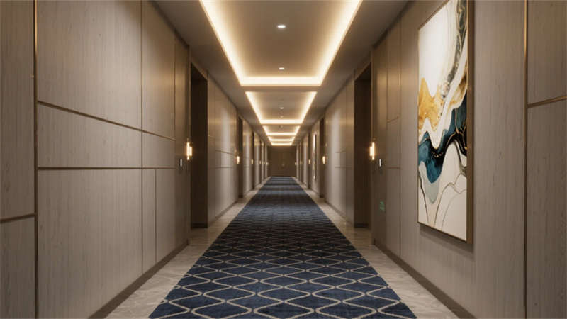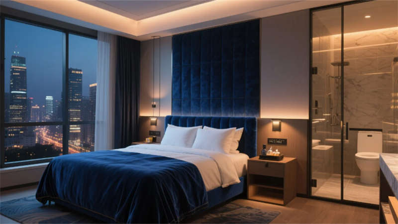 客房設(shè)計聚焦人性化體驗:大床房以深藍色絲絨床頭與城市夜景形成戲劇性對比,透明玻璃隔斷的圓形浴缸賦予空間通透感;雙床房通過原木色書桌、飄窗茶臺與抽象掛畫,平衡商務(wù)與居家需求。走廊則運用深藍色幾何地毯與隱藏式燈帶,引導(dǎo)視線至盡頭的藝術(shù)畫作,靜謐中暗藏張力。