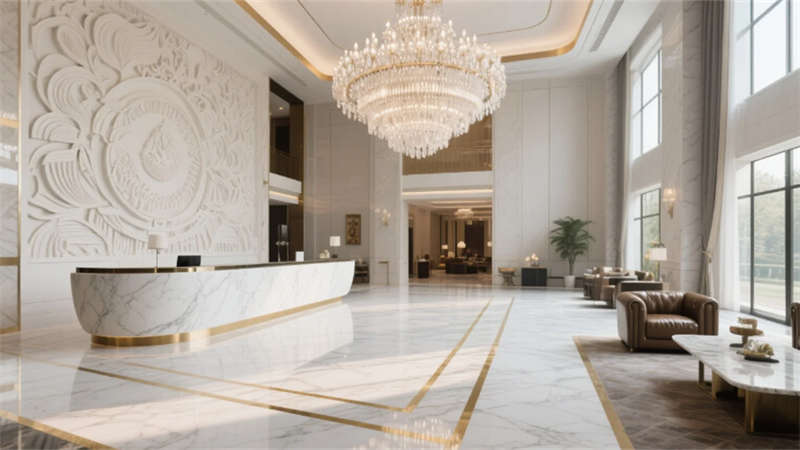 步入挑高8米的大堂,巨型水晶吊燈如銀河傾瀉,與白色大理石地面的金色脈絡(luò)相呼應(yīng);立體浮雕藝術(shù)墻融合傳統(tǒng)雕刻與現(xiàn)代光影,搭配皮質(zhì)沙發(fā)與綠植造景,營造出兼具儀式感與松弛度的迎賓空間。