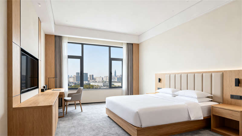 客房設(shè)計注重舒適與便捷,整體風(fēng)格延續(xù)簡約風(fēng),家具選擇線條簡潔的款式,軟裝搭配以柔和的色彩為主,營造出寧靜放松的休憩環(huán)境,同時兼顧收納功能,讓客房空間整潔有序。?
