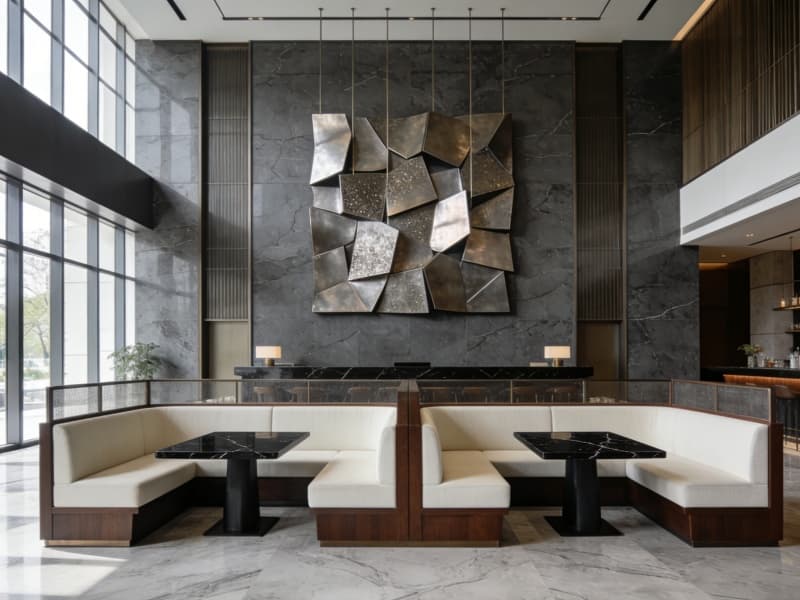 酒店一層為公共區域,大堂地面鋪淺灰色大理石,前臺背景墻以巖板結合藝術裝置,彰顯格調。大堂吧設半私密卡座,供客人休憩交流。全日制餐廳配備開放式廚房,可讓客人直觀感受美食制作過程。