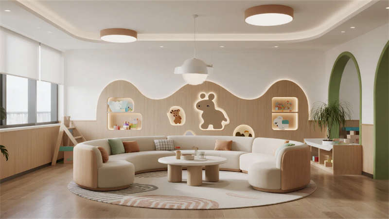 這座親子民宿以現(xiàn)代簡約美學為靈魂,將自然元素與童趣設(shè)計無縫銜接。空間摒棄繁復(fù)裝飾,選用淺木、純白與低飽和色彩鋪陳,弧形線條與柔和光影交織,營造出寧靜而溫暖的氛圍。從大堂的嵌入式動物燈箱到套房的樹屋床鋪,每一處細節(jié)都暗藏親子互動巧思,安全圓角家具與軟包地臺呵護孩童探索的每一步。