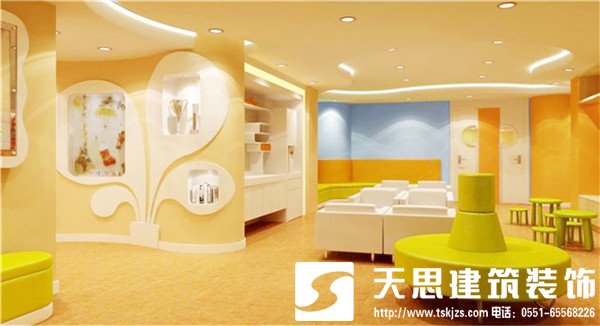 幼兒園如果采用歐式裝修,一定是那種簡歐風格。簡單的吊頂造型,相對簡單的線條。體現出整個幼兒園的層次即可。合肥天思幼兒園設計師提醒大家切勿把整個教室裝修的非常歐式、非常復雜,因為小朋友們還難以理解這些復雜的東西,而過于復雜的造型,分散幼兒的注意力,影響老師的授課。簡單的墻面幾乎沒有過多的裝飾,把所有的視覺重心放在幼兒的教具上。