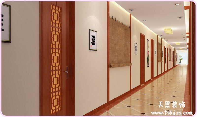 走廊是室內(nèi)流通空間的主要部分,其空間特點(diǎn)是狹長(zhǎng),且缺少變化,人在這種空間中容易產(chǎn)生單調(diào)感。因此,在設(shè)計(jì)上應(yīng)做一定的藝術(shù)處理。使其既不能過于華麗、復(fù)雜,也不宜過于簡(jiǎn)單、呆板、應(yīng)在墻壁上做一定的裝飾點(diǎn)綴。如做出口線、偏倚柱、外門套和墻壁裝飾線條的藝術(shù)處理,以及字畫或燈光的點(diǎn)綴。在特殊功能區(qū)的路段,可以做色彩變化或不同的裝飾處理,從而形成 統(tǒng)一中有變化的視覺效果。在通常情況下,走廊的設(shè)計(jì)要求是:應(yīng)有充足的光照度、統(tǒng)一和諧的界面裝飾,清新淡雅的色調(diào)和明確的導(dǎo)向指示。