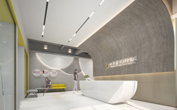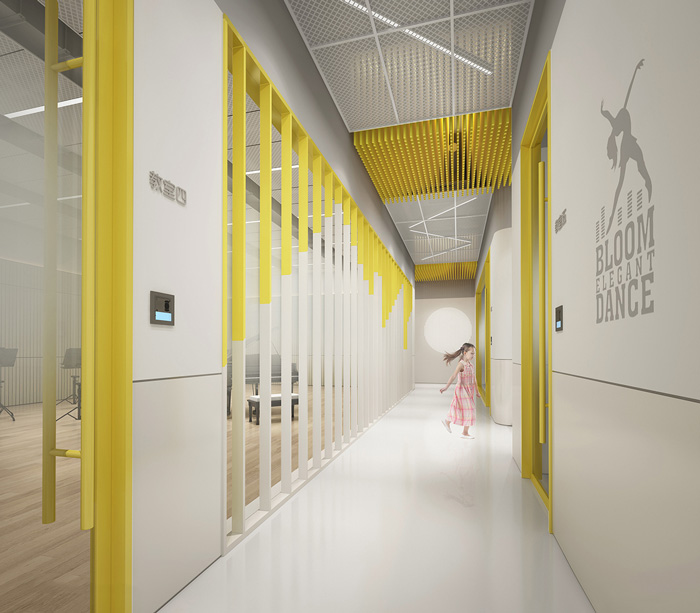 此處藝術(shù)學(xué)校設(shè)計(jì)中,告別了五彩斑斕的顏色,突出了空間的簡潔與干凈,用黃色做為點(diǎn)綴色提升空間的趣味性。