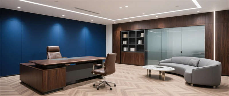 總裁辦公室:人字拼木地板與深胡桃木家具提升質(zhì)感,深藍藝術(shù)漆背景墻強化品牌識別;