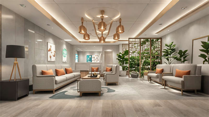 本2000平中醫(yī)院設(shè)計(jì)融合傳統(tǒng)中醫(yī)文化與現(xiàn)代醫(yī)療功能,采用 ' 療愈之境 ' 核心理念。空間規(guī)劃采用 ' 回' 字形動(dòng)線,門診、診療、康復(fù)三大功能模塊環(huán)繞中央庭院布局。色彩體系以米白、淺灰為基底,點(diǎn)綴赭石、黛青等傳統(tǒng)中藥色彩,墻面肌理漆模擬紙張質(zhì)感呼應(yīng)古籍文獻(xiàn)。診療區(qū)域采用模塊化隔斷系統(tǒng),兼顧隱私與通風(fēng)需求。智能照明系統(tǒng)可模擬晝夜節(jié)律變化,候診區(qū)座椅集成無(wú)線充電功能。重點(diǎn)區(qū)域設(shè)置 AR 中醫(yī)文化互動(dòng)裝置,住院部走廊每 10 米設(shè)置中藥香薰擴(kuò)散點(diǎn)。材料選擇注重環(huán)保性與耐久性,地面采用防菌 PVC 卷材,墻面使用易清潔的納米涂層。整體設(shè)計(jì)通過(guò)現(xiàn)代設(shè)計(jì)語(yǔ)言詮釋中醫(yī) ' 天人合一 ' 理念,打造兼具專業(yè)醫(yī)療功能與人文關(guān)懷的現(xiàn)代化中醫(yī)院空間。