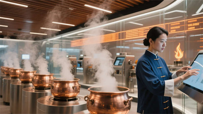 露天庭院白石鋪就太極紋路,素衣身影在紫竹霧靄間起勢推掌,漏窗剪出晨練動態。名醫診室紅木案上脈枕微溫,博古架藥材標本與滿墻醫典沉淀千年智慧。智慧煎藥中心的銅鍋陣列于胡桃木頂下吞吐蒸汽,光影交織傳統與現代。